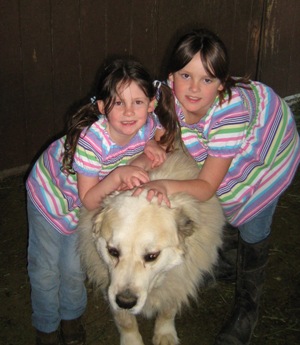 Part of our plan in getting this daily escape to come to a halt is giving him a partner. In a week to two weeks I will pick up a 3 month old female from a friend in Oregon. We have high hopes supplying him with a buddy will be helpful in curbing his daily climb overs. Spinner was very happy for about 6 years with her partner Kingston(below with Claire on left and Emmy on right) until his untimely passing. Crossing all that dangles the adverse effect won't happen, he teaches her his tricks. We still have 5 strand barbed wire for perimeter fencing around all the 42 acres. Not exactly Pyr. fencing but it will be a bit before we can afford to fence the perimeter with 47" field fencing . So cross your fingers and dew claws for us that the cute young thing from the great state of Oregon turns this California boys head!